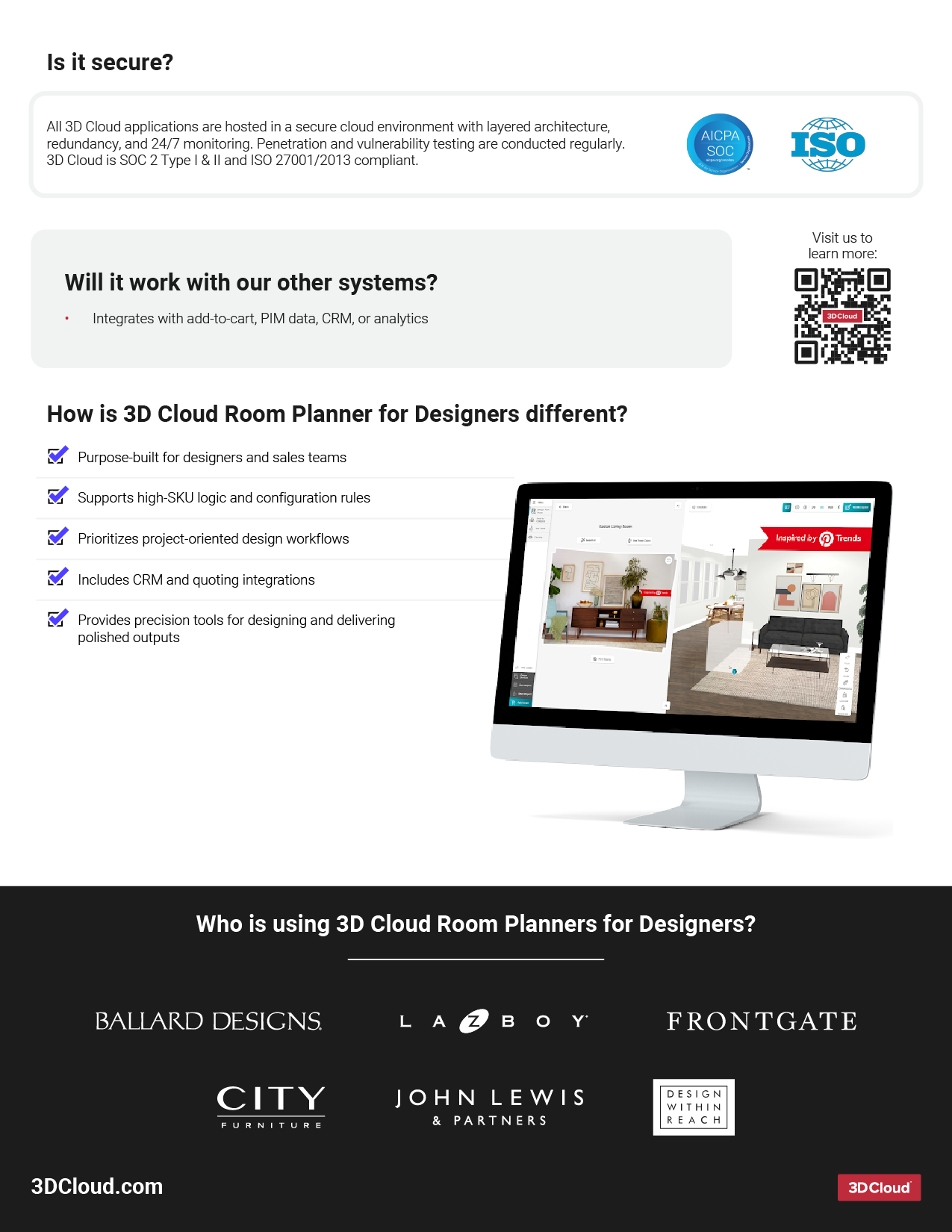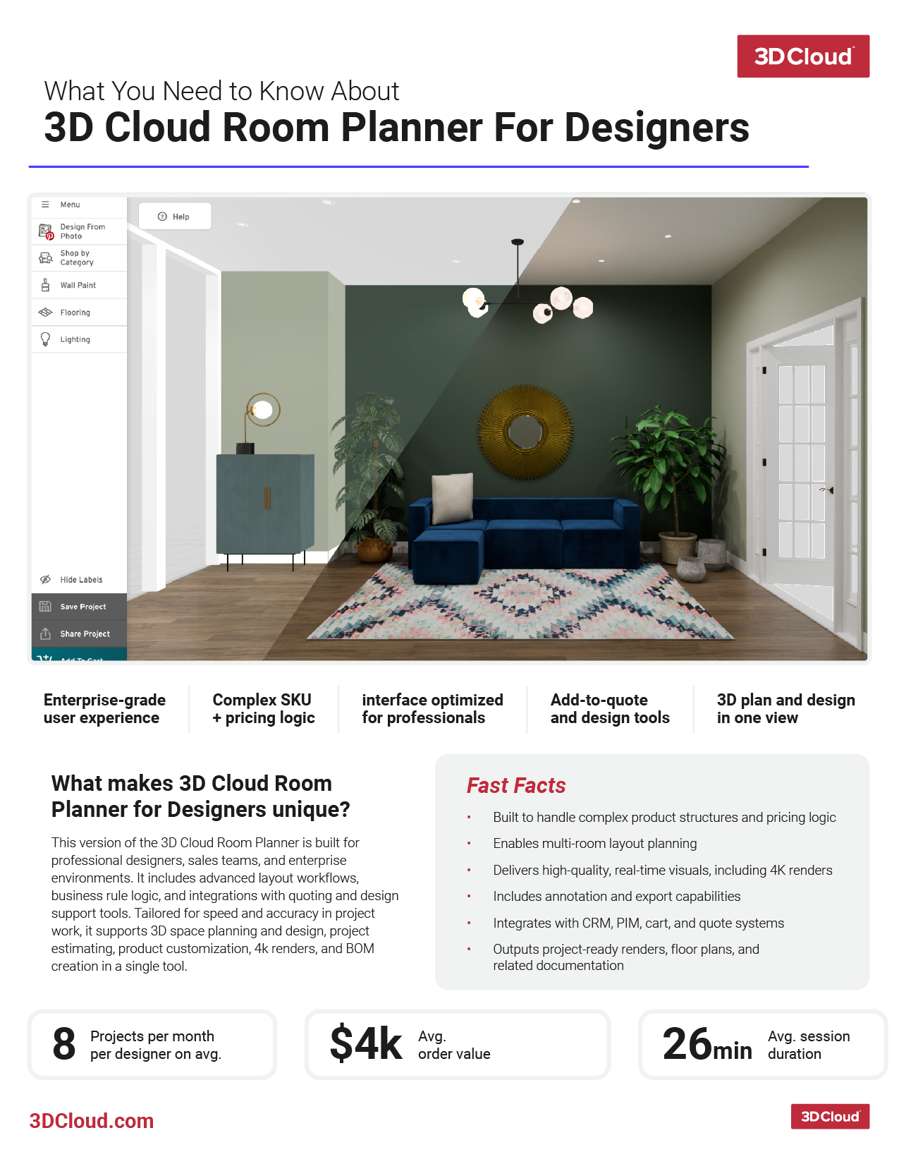 Can one app do it all? 3D Cloud’s suite of Room Planners is loved by interior designers, sales associates, and e-commerce shoppers alike. Professional interior designers rave about our ProCamera tools, measurement features, and 3D Renders; sales associates watch ticket sizes climb when they help in-store shoppers problem-solve on the fly, and online shoppers can plan purchases and check out with limited catalog and design knowledge.